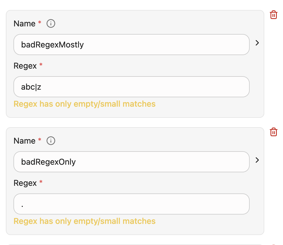 The system identifies problematic regex policies through three primary indicators:- High match count