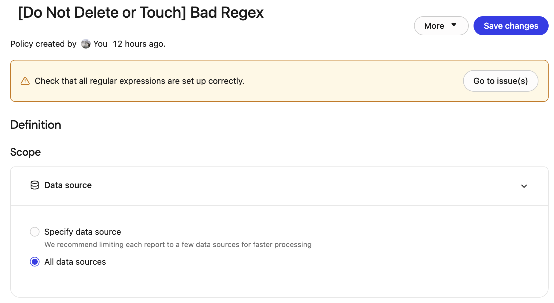 - Policy details: A banner at the top of the policy details page summarizes that one or more regex patterns are generating suspicious or unhelpful matches and prompts the administrator to review the configuration. Click Go to issue(s) to view the exact issue.