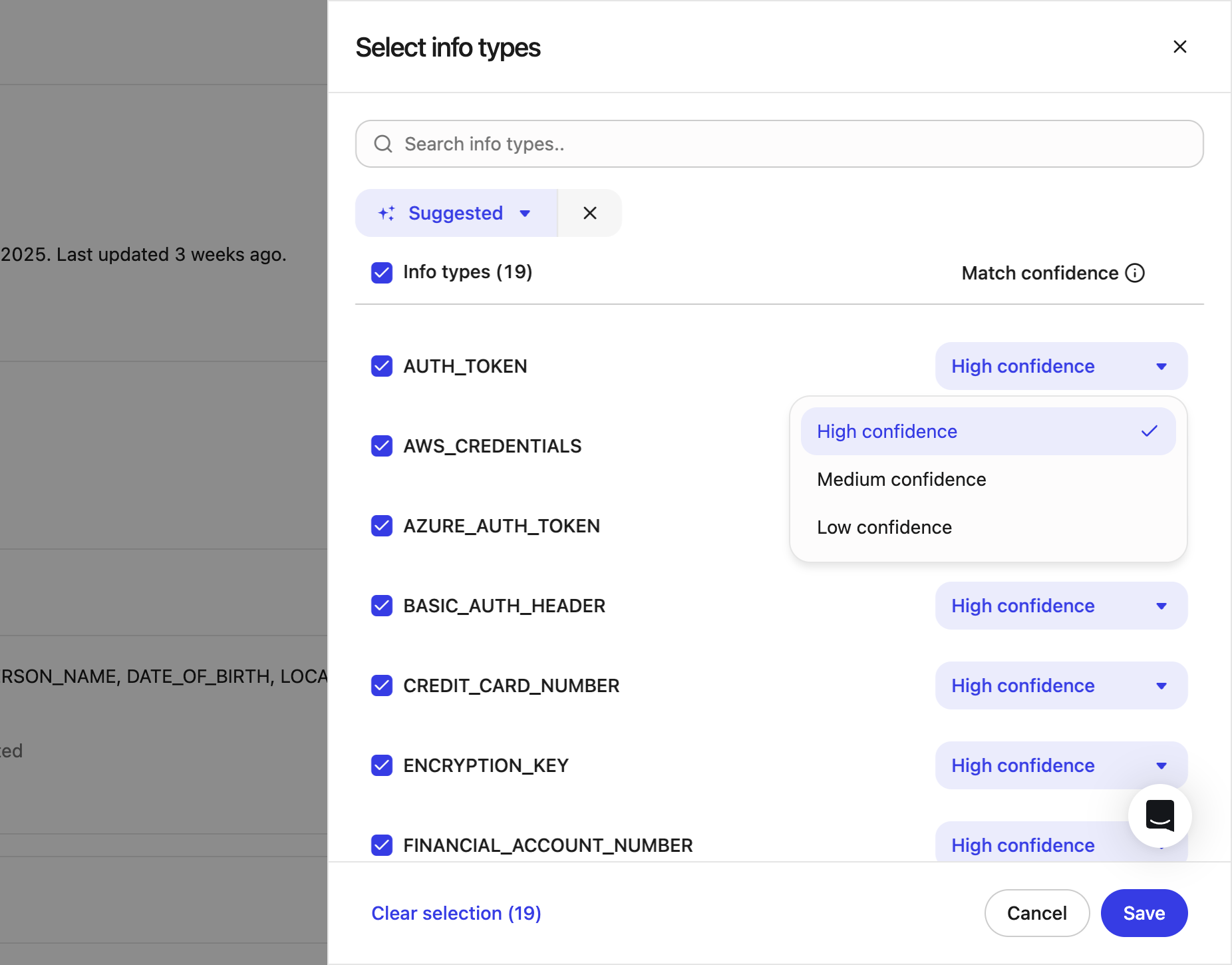 - Medium: Flag matches with medium or higher confidence. Consider enabling this for highly sensitive info types where broader coverage is important.