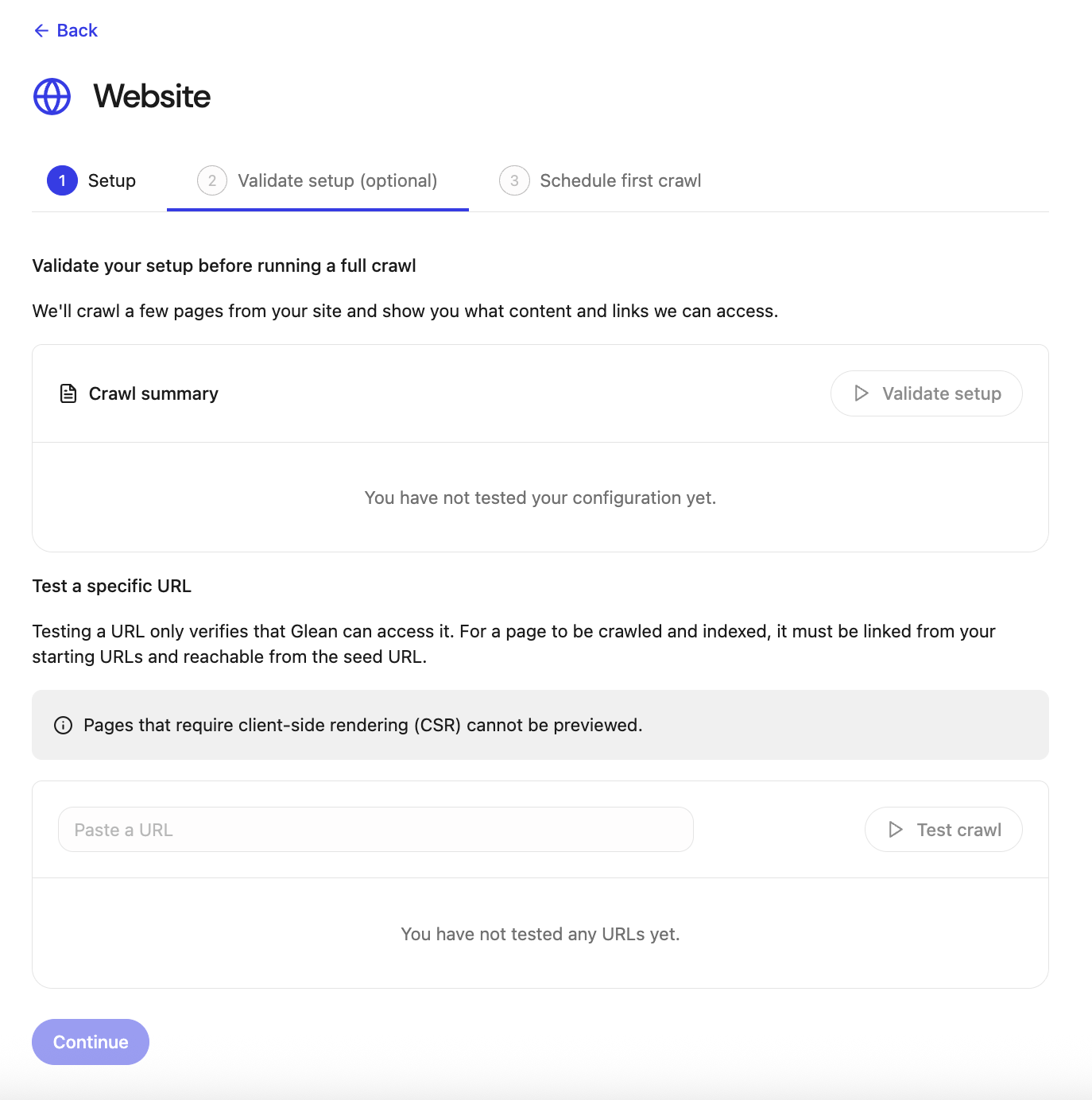 The Crawl summary allows you to verify your site configuration by performing a limited crawl to preview the content and links accessible to Glean.- Click Validate setup in the Crawl summary panel. This crawls a few pages from your site and show you what content and links Glean can access.